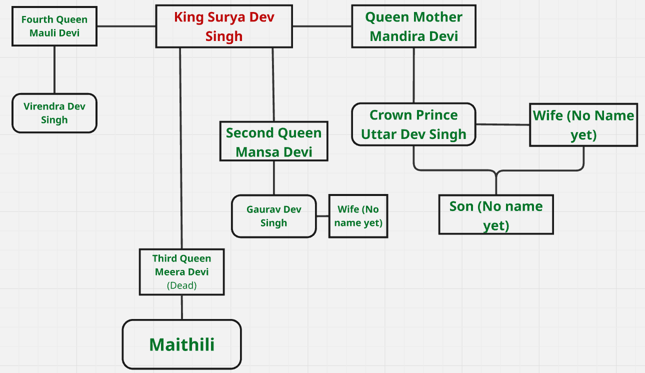 Therefore, Maithili sat between the Queen Mother and King, while her three elder brother was sitting in their seats respectively.